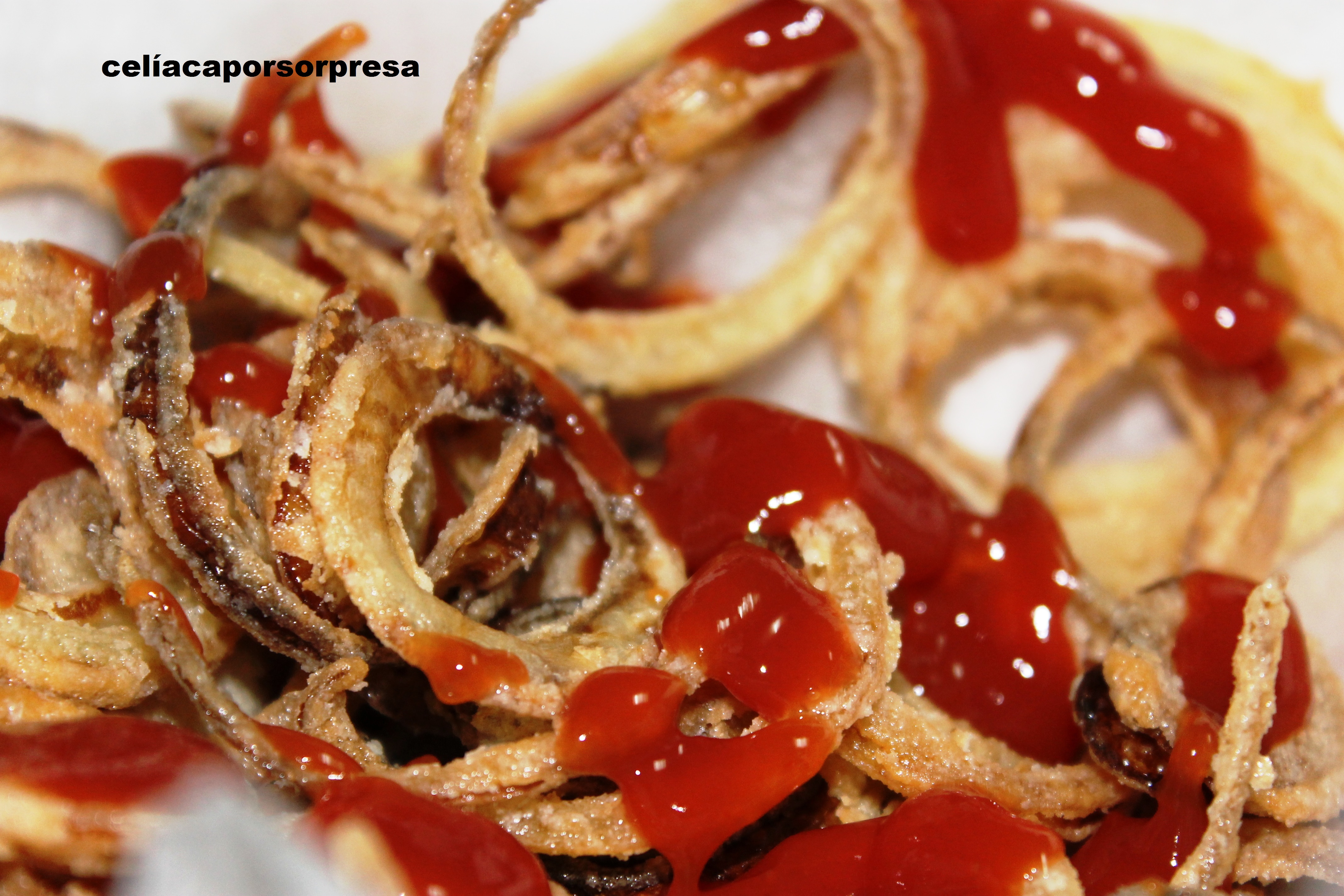 Una vez listos nuestros aros de cebolla crujientes, si les ponéis ketchup estilo americano sin gluten os encontraréis con un sabor muy parecido al de los aros de cebolla glutaneros del VIPS, que yo aún recuerdo.
