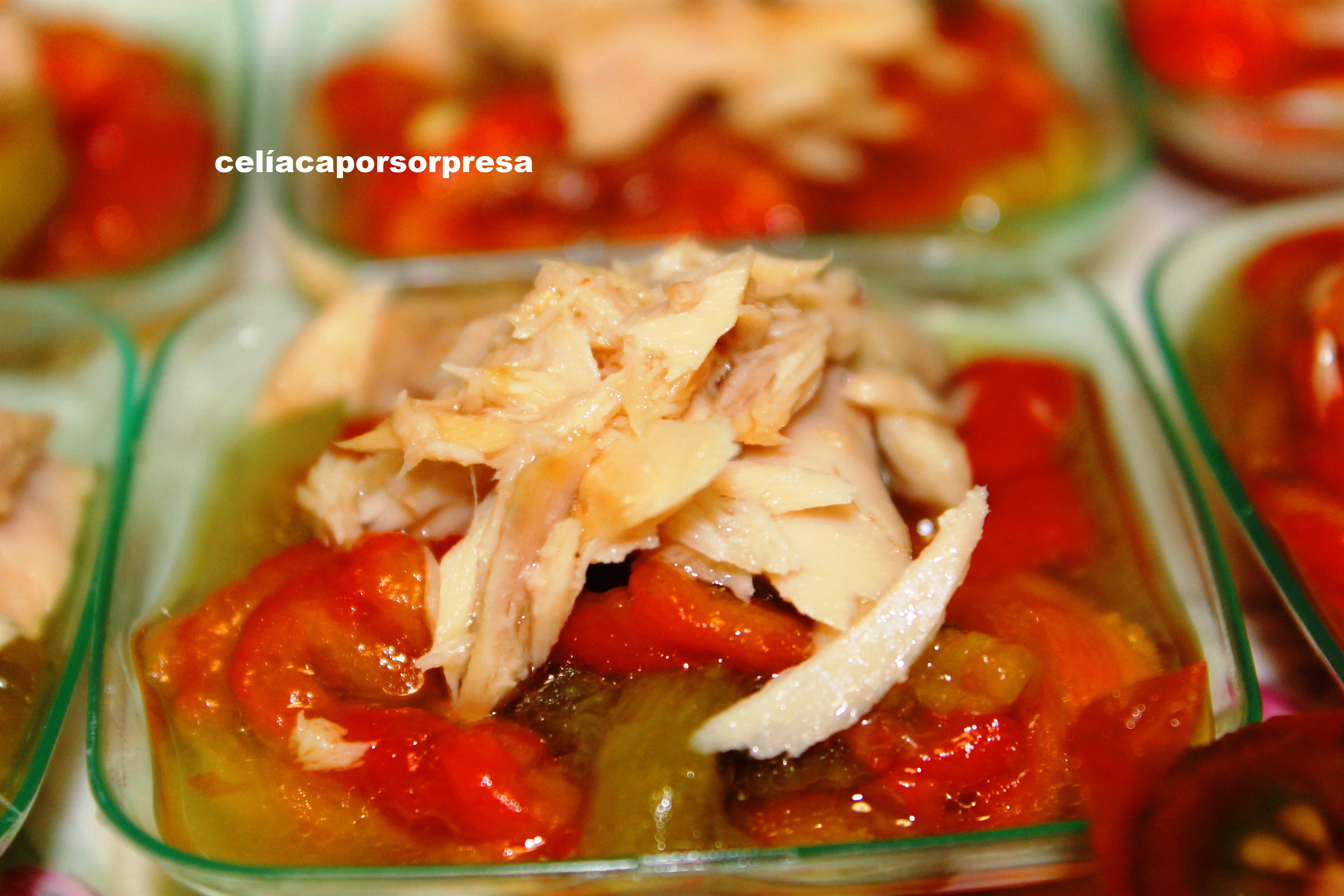 Para emplatar colocamos en cada platito abundante ensalada de pimientos y ponemos encima un poquito de la melva canutera bien escurrida.