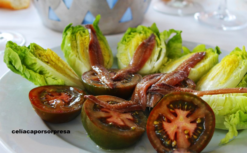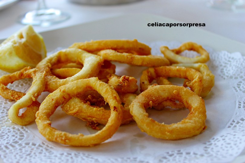 Tras mirar la carta y preguntar, decidimos pedir la ensalada de cogollos con tomate y sardina ahumada y calamares a la romana rebozados con harina de garbanzo sin gluten para todos.