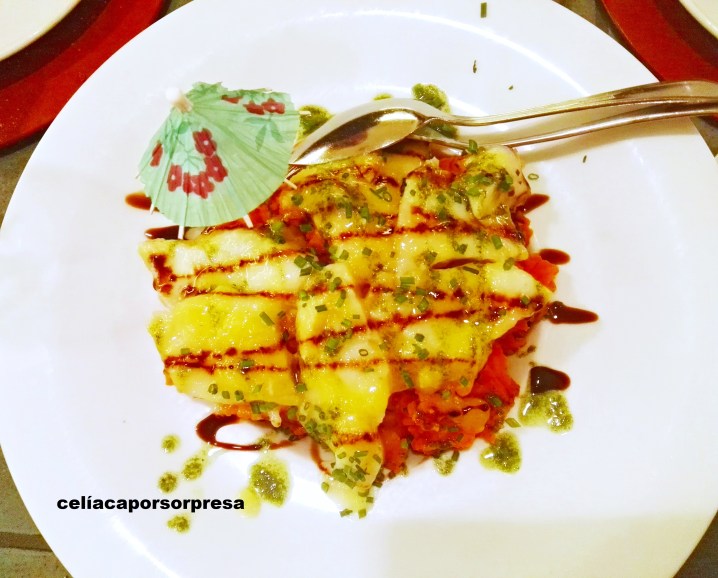 De entrante decidimos compartir su ensalada de pétalos de bacalao con patatas revolconas y vinagreta de albahaca. Original, sabrosa y muy rica que no defraudó.
