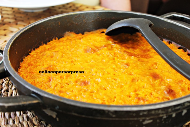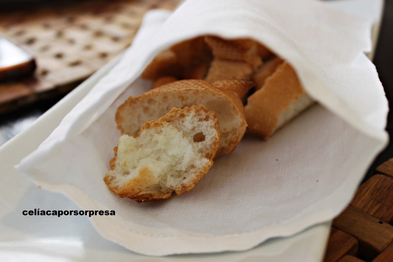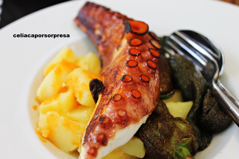 Tras comentar que éramos dos celíacas y dejarnos aconsejar, decidimos pedir como entrantes su pastel de cabracho que sirvieron con nuestro pan sin gluten de forma independiente y totalmente separado del pan normal y el pulpo a la brasa acompañado de patatas y pimientos de padrón.