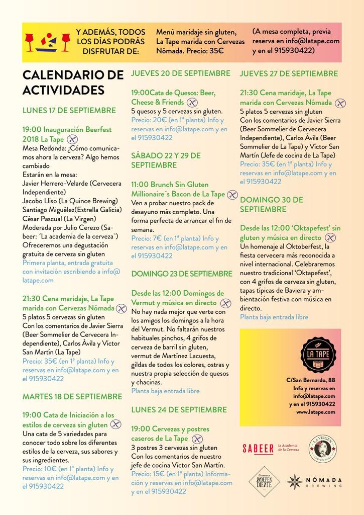 No os olvidéis que es importante reservar con antelación y si eres celíac@ especificarlo en la reserva porque las plazas de las actividades son limitadas (info@latape.com ó llamando al 91 593 04 22).