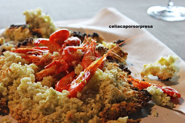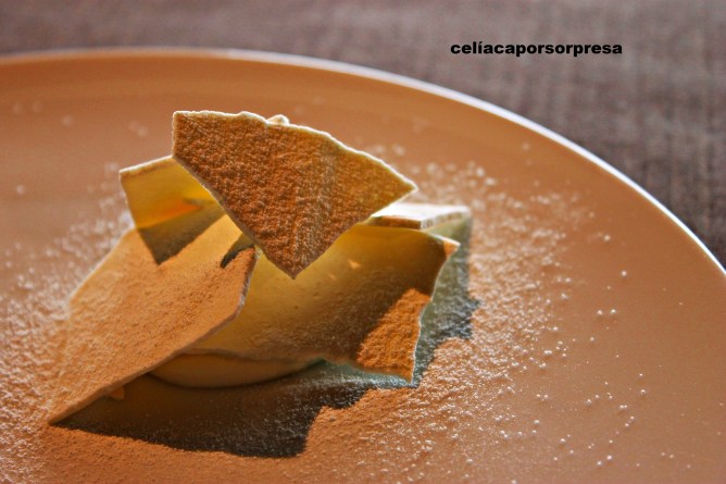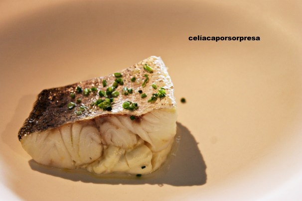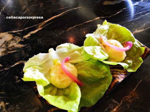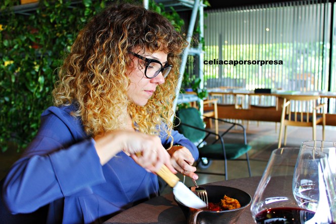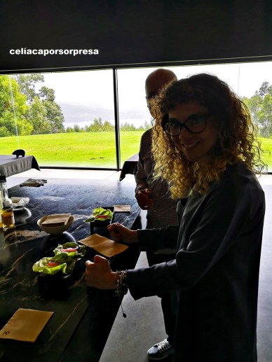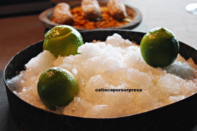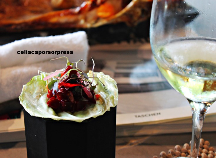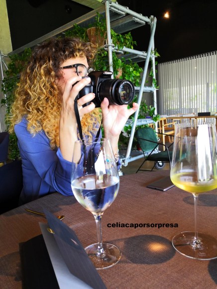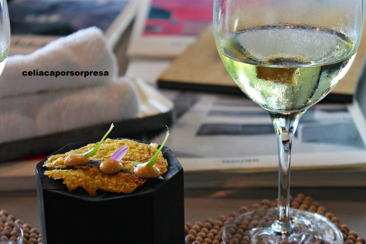 Antes de pasar a la mesa, recordé mi condición de celíaca y en un sofá anexo degustamos los dos primeros aperitivos. El tercer aperitivo te invitan a que veas cómo lo preparan en directo al ladito de la mesa; esto fue una sorpresa y nos gustó 😉