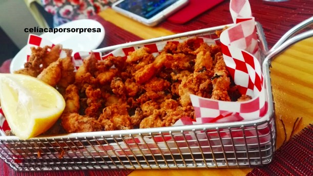 Como en las anteriores celiquedadas optamos por pedir platos para compartir entre todas. Tras mirar un buen rato la carta finalmente nos decantamos por sus croquetas, patatas bravas, chopitos y su cachopo. También pedimos unos huevos rotos con jamón para que Patricia, de Momentos sin Gluten, que también es intolerante a la lactosa no se quedara con hambre.