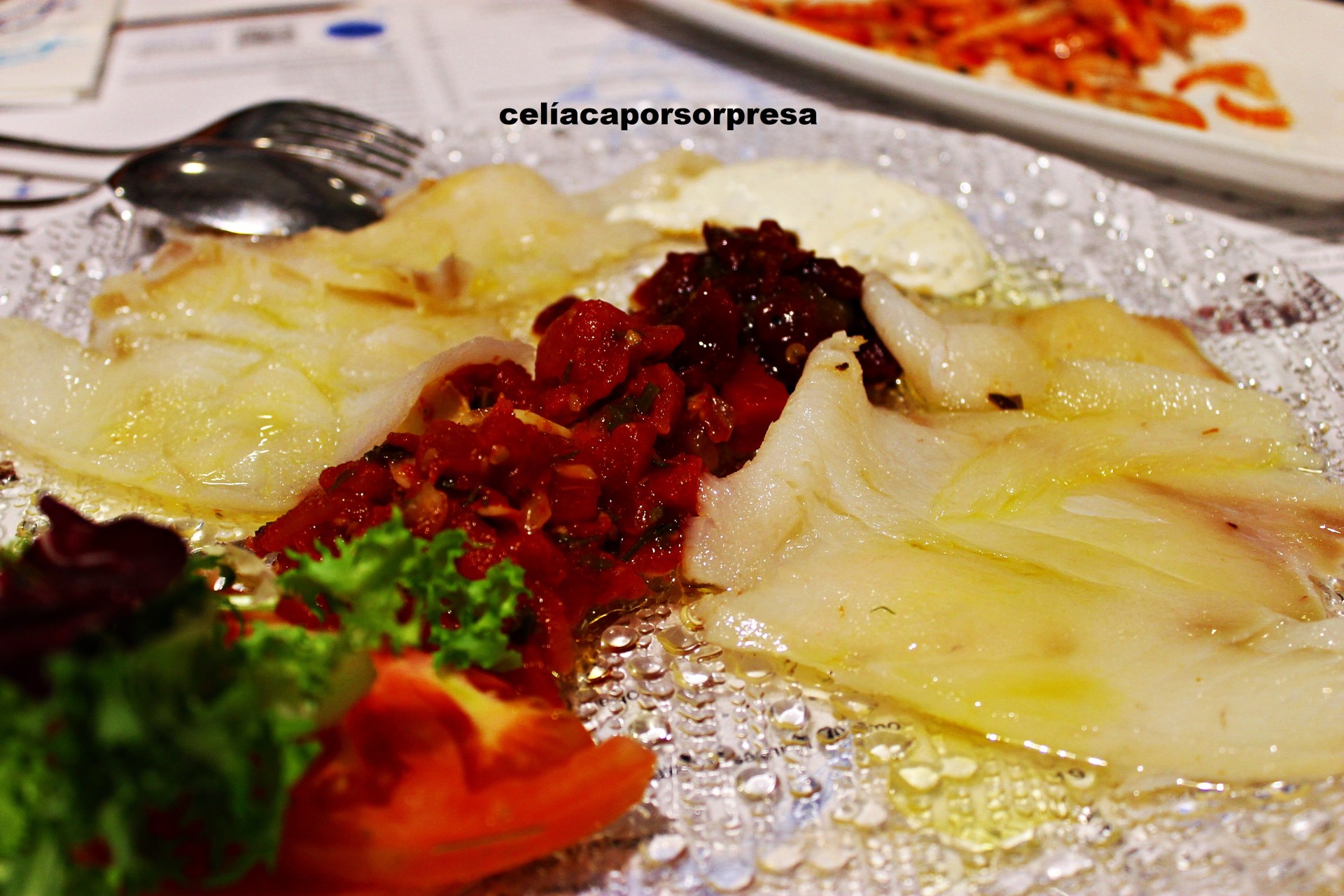 Reservamos varios días antes por teléfono y avisamos que seríamos dos personas celíacas. Sabíamos que es un restaurante clásico, de los de toda la vida, en el que el pescado fresco del día, el atún y el marisco triunfan y mucho y ya me aseguraron que tendríamos pan sin gluten y que nos podrían adaptar casi toda la carta.