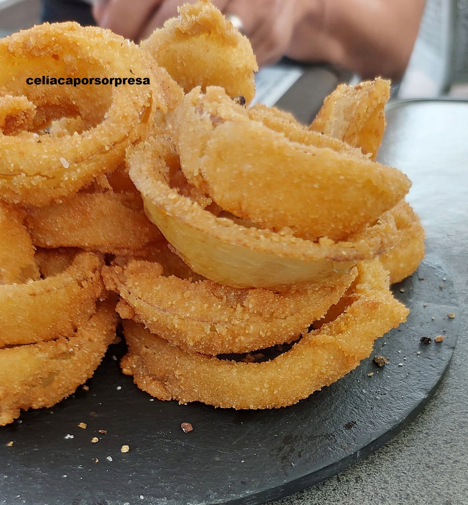 ¿Mi plato preferido? Los aros de cebolla. Os confieso que es la primera vez que, tras 12 años, los encuentro en un local fuera de casa aptos y seguros. ¡¡Me apasionan!!